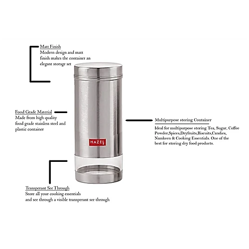 It is made from high quality food grade stainless steel container which ensures strength and quality. This modern design see through container is perfect for your beautiful home and kitchen. It is ideal for storing tea, sugar, coffee powder, spices, dry fruits, biscuits, candies, namkeen and cooking essentials. It is a set of 2 containers.